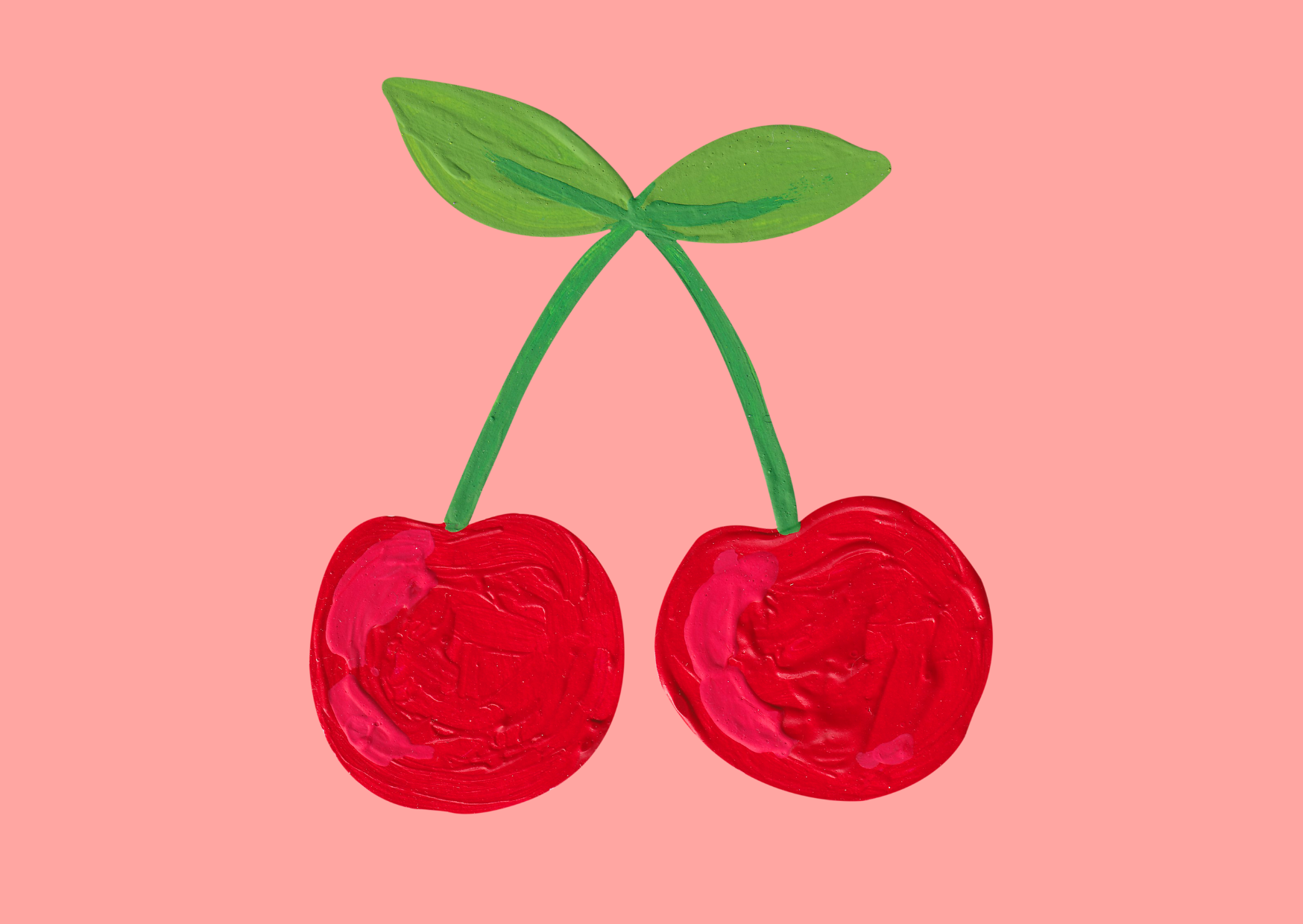 Een speelse kaart met kersen op een zachtroze achtergrond. Perfect om iemand een lief berichtje te sturen of beterschap te wensen.
